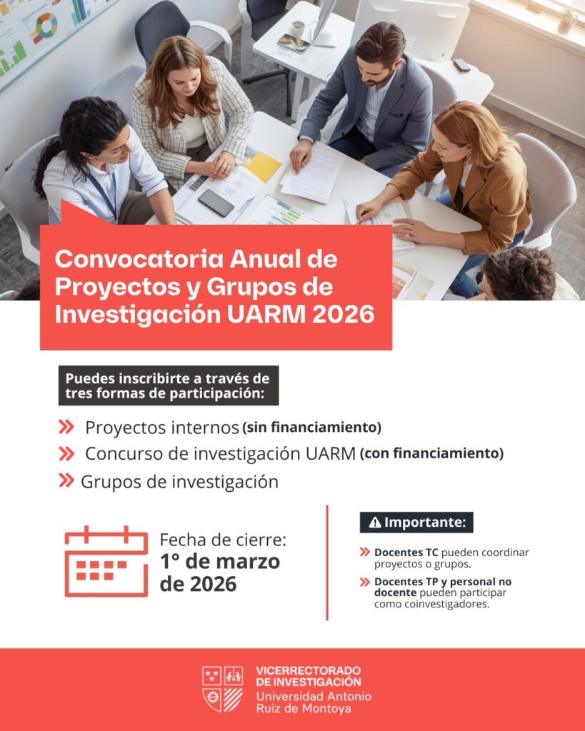 El Vicerrectorado de Investigación invita a docentes, egresados, estudiantes y colaboradores a participar en la Convocatoria Anual de Proyectos y Grupos de Investigación UARM 2026, una oportunidad para fortalecer la producción científica y la colaboración interdisciplinaria en nuestra comunidad universitaria.