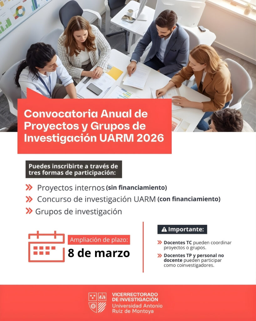 El Vicerrectorado de Investigación invita a docentes, egresados, estudiantes y colaboradores a participar en la Convocatoria Anual de Proyectos y Grupos de Investigación UARM 2026, una oportunidad para fortalecer la producción científica y la colaboración interdisciplinaria en nuestra comunidad universitaria.