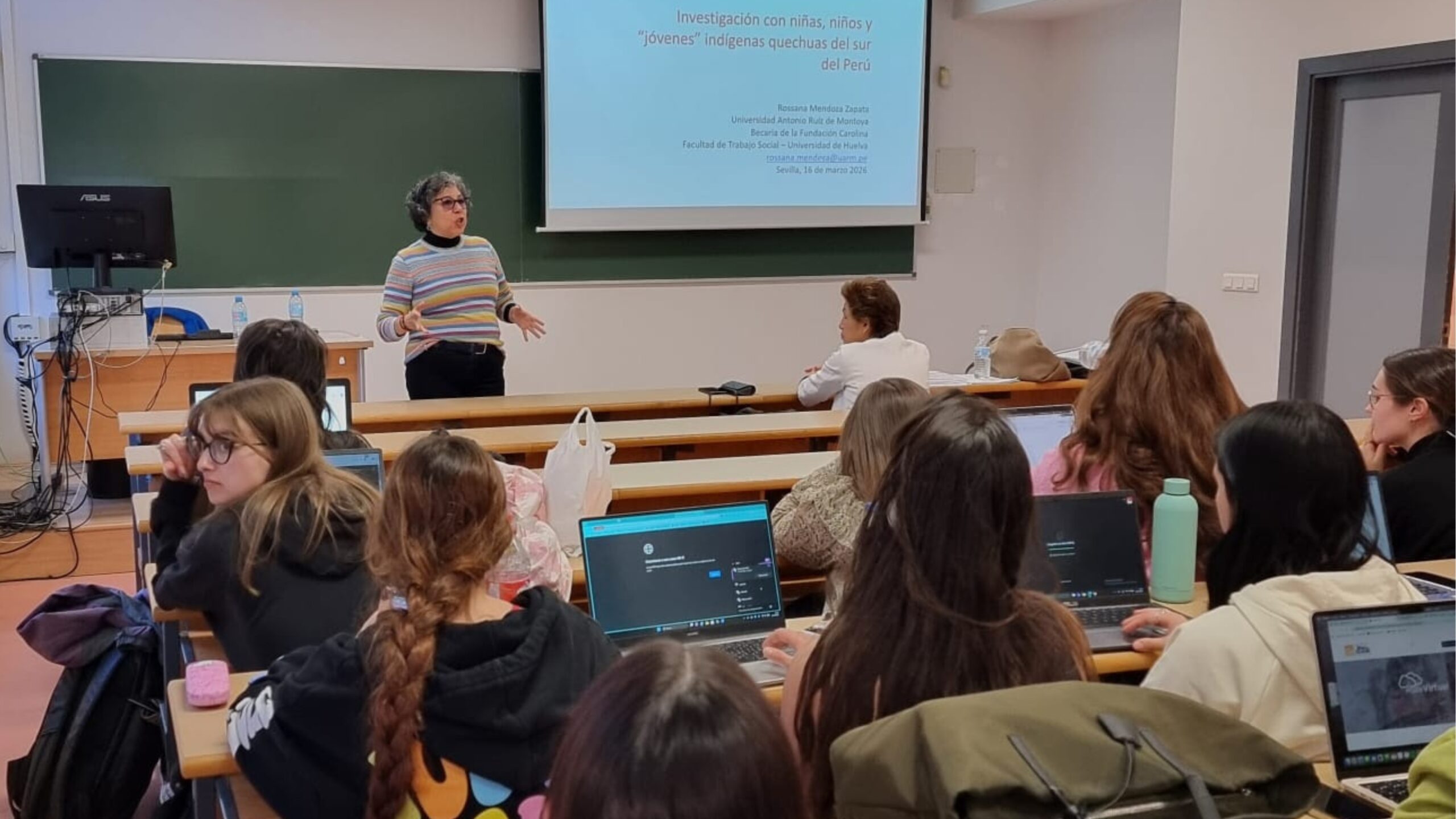 La Dra. Mendoza también participó en sesiones académicas con estudiantes de maestría, doctorado y pregrado. En una de ellas abordó el tema de la investigación con niñas, niños y juventudes indígenas quechuas del sur del Perú, compartiendo aprendizajes metodológicos y hallazgos construidos desde el trabajo de campo.
