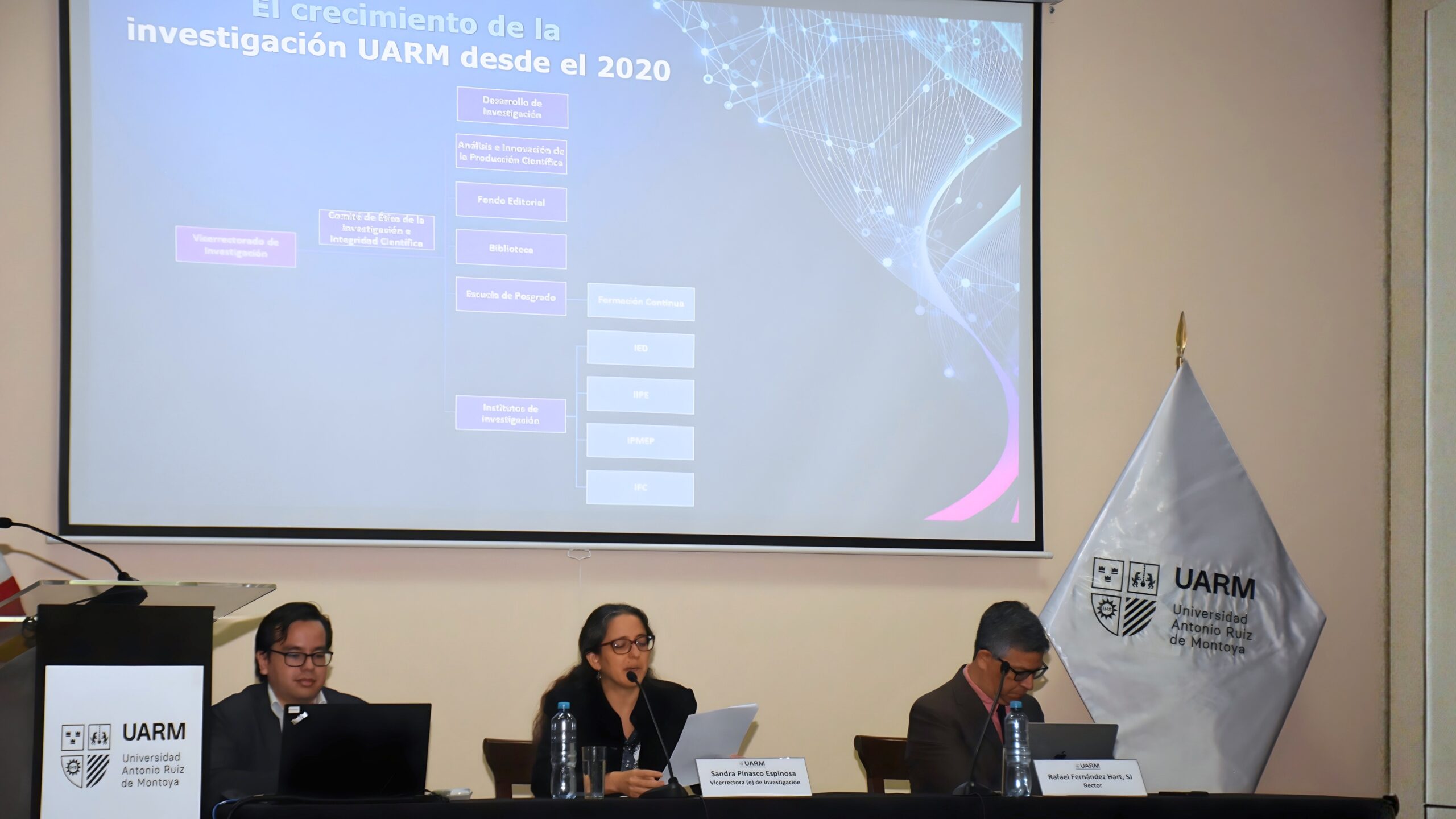 La VIII Semana de Investigación de la Universidad Antonio Ruiz de Montoya (UARM) inició con una ceremonia que reunió a autoridades, docentes y estudiantes comprometidos con el desarrollo del conocimiento y la reflexión crítica. La inauguración estuvo a cargo de la Mg. Sandra Pinasco Espinosa, vicerrectora de investigación, y del rector Rafael Fernández Hart, SJ. La moderación estuvo a cargo de Aaron Wong León, coordinador (e) de Análisis e Innovación de la Producción Científica (AIPC).