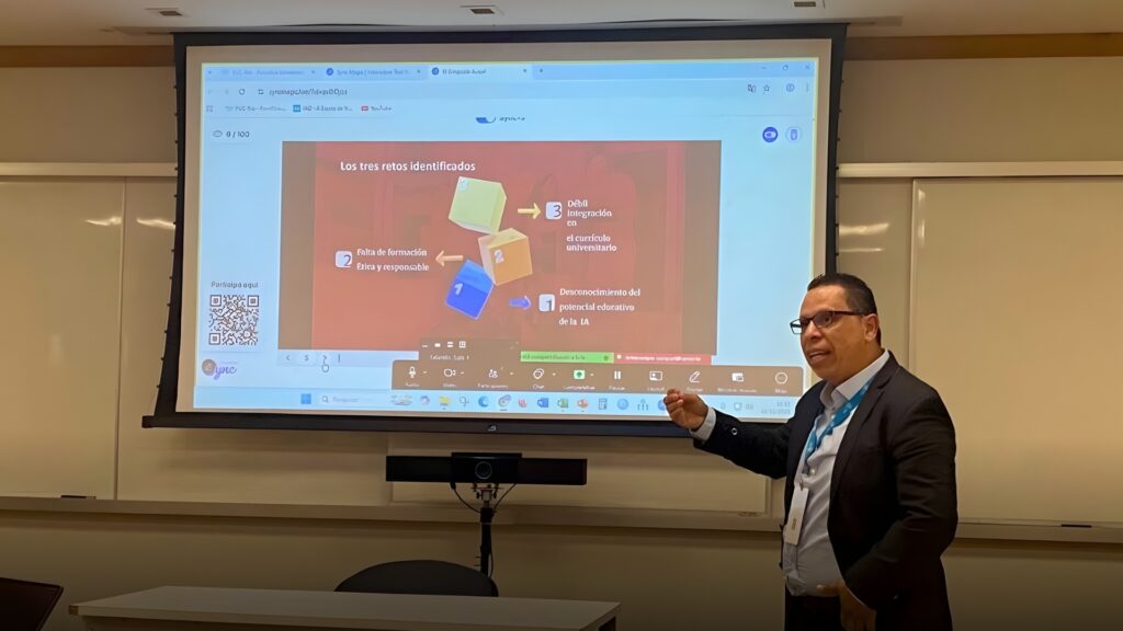 La presentación destacó que la IA no debe entenderse solo como una herramienta de automatización, sino como un recurso capaz de transformar el aprendizaje, fortalecer el rol docente y fomentar competencias críticas y éticas en estudiantes. Su propuesta “IA con sentido” plantea una formación que combine práctica, reflexión humanista y políticas institucionales para un uso responsable, articulada desde el aprendizaje activo, el constructivismo social y el paradigma pedagógico ignaciano.